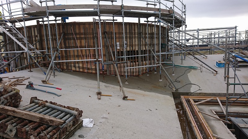 こちらは、勾配スラブの上に曲面壁の施工で、水平レベル、建入れが難しい事例になります。